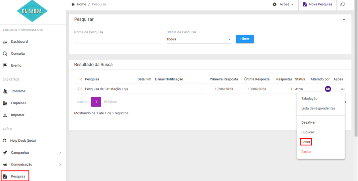Em seu menu lateral clique na opção Pesquisa e logo após será apresentado todas as pesquisas cadastradas. Caso não saiba como criar uma pesquisa clique aqui e acesse o tutorial.