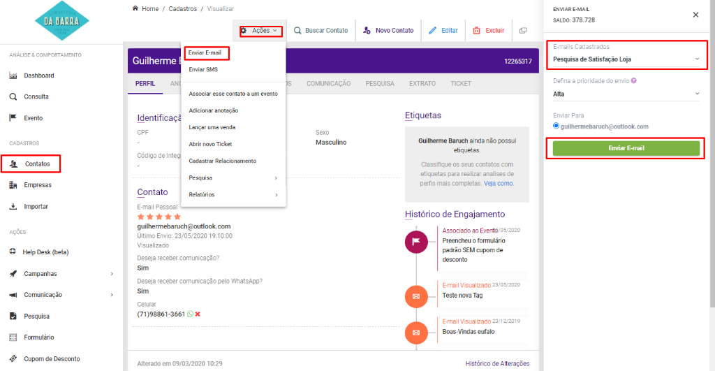 Depois de realizar todas as alterações, realize um teste de envio clicando em contatos, encontre o seu cadastro e clique em Ações → Enviar e-mail → Escolha o e-mail cadastrado e depois de definir a prioridade como alta clique enviar. Dessa forma conseguirá testar o e-mail e confirmar se o botão de Pesquisa está funcionando.