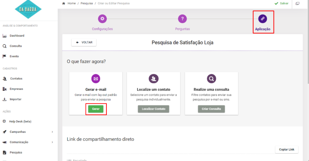 Escolha a Pesquisa que deseja gerar um e-mail e clique em avançar até chegar no botão Aplicação. Clique na opção Gerar e-mail e o sistema irá abrir uma nova guia para que seja realizadas as alterações necessárias.